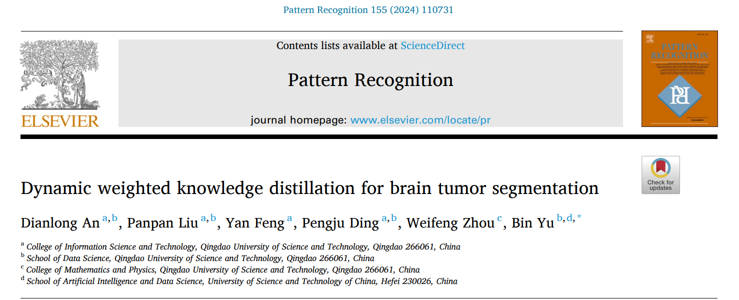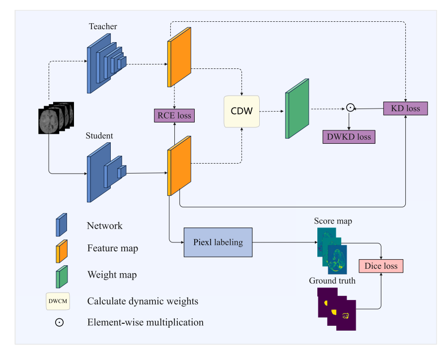 近日,爱游戏体育登录入口2021级研究生安典龙在人工智能领域顶级期刊Pattern Recognition (IF=7.5) 发表了题为“Dynamic Weighted Knowledge Distillation for Brain Tumor Segmentation”的高水平论文,报道了压缩脑肿瘤模型的算法——DWKD。该算法在压缩脑肿瘤模型上表现出非常优秀的性能。