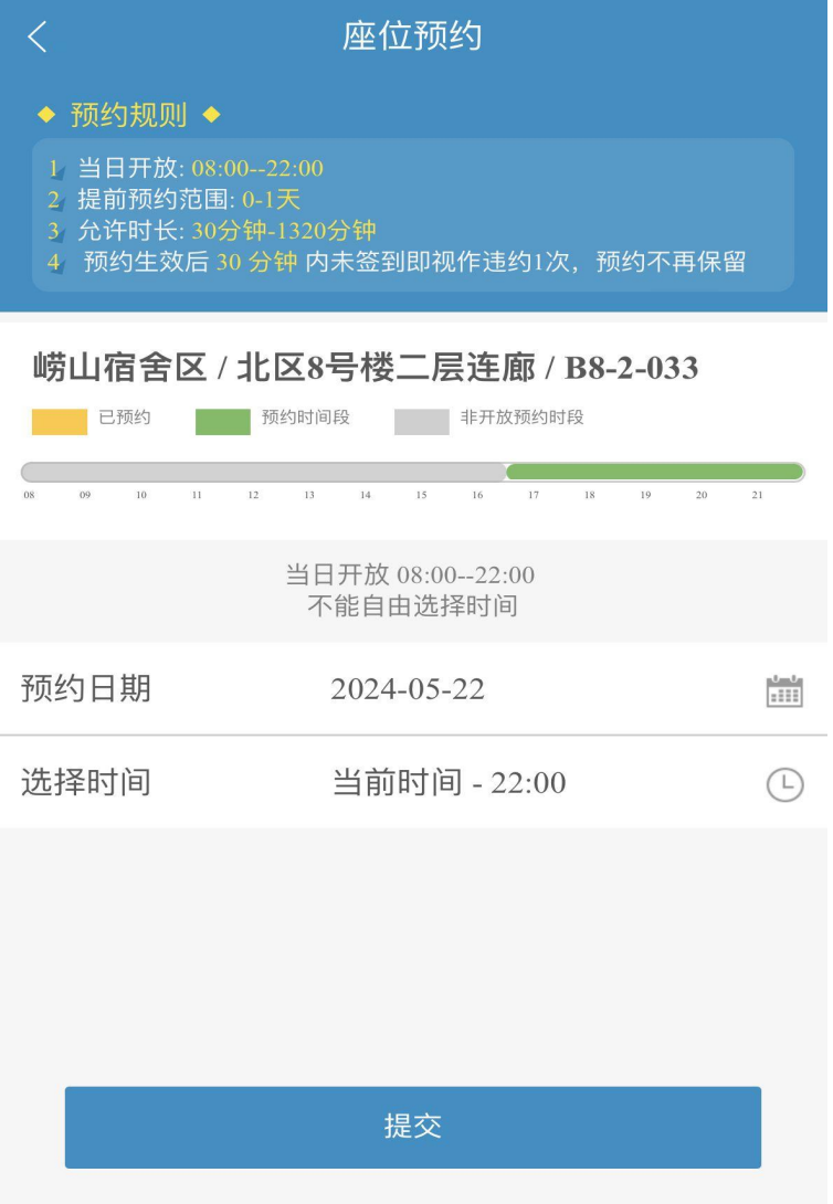 3.进入座位预约界面,选择“崂山校区→崂山宿舍区→北区8号楼二层连廊”。